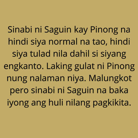 Sinabi ni Saguin kay Pinong na hindi siya normal na tao, hindi siya tulad nila dahil si siyang engkanto. Laking gulat ni Pinong nung nalaman niya. Malungkot pero sinabi ni Saguin na baka iyong ang huli nilang pagkikita.