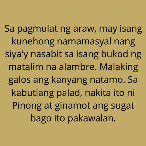 Sa pagmulat ng araw, may isang kunehong namamasyal nang siya'y nasabit sa isang bukod ng matalim na alambre. Malaking galos ang kanyang natamo. Sa kabutiang palad, nakita ito ni Pinong at ginamot ang sugat bago ito pakawalan.