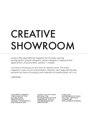 I am here to showcase you the work of creative minds. This entire magazine is open to your interpretation. However, each page intentionally presents my vision of unifying a vast collection of creative ability. let’s run.