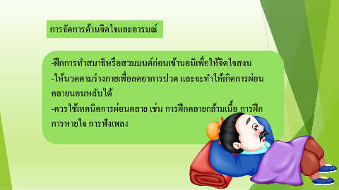 การจัดการด้านจิตใจและอารมณ์ -ฝึกการท าสมาธิหรือสวมมนต์ก่อนเข้านอนิเพื่อให้จิตใจสงบ -ให้นวดตามร่างกายเพื่อลดอาการปวด และจะท าให้เกิดการผ่อน คลายนอนหลับได้ -ควรใช้เทคนิคการผ่อนคลาย เช่น การฝึกคลายกล้ามเนื้อ การฝึก การหายใจ การฟังเพลง