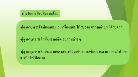 การจัดการด้านสิ่งแวดล้อม -ผู้สูงอายุ ควรจัดห้องนอนและเครื่องนอนให้สะอาด อากาศถ่ายเทได้สะดวก -ผู้สูงอายุควรหลีกเลี่ยงจากเสียงรบกวนต่าง ๆ -ผู้สูงอายุควรหลีกเลี่ยงจากแสงสว่างที่มีระดับความเข้มของแสงมากเกินไป โดย การปิดไฟ ปิดม่าน