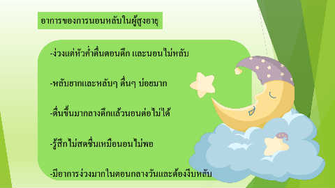 อาการของการนอนหลับในผู้สูงอายุ -ง่วงแต่หัวค ่าตื่นตอนดึก และนอนไม่หลับ -หลับยากและหลับๆ ตื่นๆ บ่อยมาก -ตื่นขึ้นมากลางดึกแล้วนอนต่อไม่ได้ -รู้สึกไม่สดชื่นเหมือนอนไม่พอ -มีอาการง่วงมากในตอนกลางวันและต้องงีบหลับ