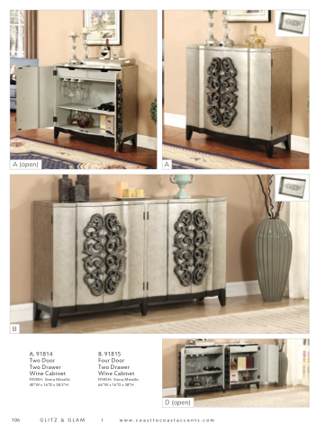 A (open) A B D (open) 106 GLITZ & GLAM I www.coasttocoastaccents.com A. 91814 Two Door Two Drawer Wine Cabinet FINISH: Sierra Metallic 40”W x 16”D x 38.5”H B. 91815 Four Door Two Drawer Wine Cabinet FINISH: Sierra Metallic 66”W x 16”D x 38”H