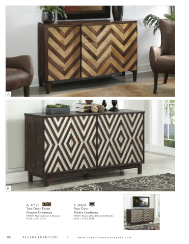 A B A. 37125 Jadu Two Door Three Drawer Credenza FINISH: Herring Brown & Natural 55”W x 18”D x 36”H B. 36636 Four Door Media Credenza FINISH: Diamondhead Brown & Metallic 66”W x 17”D x 35”H MEDIA 188 ACCENT FURNITURE I www.coasttocoastaccents.com