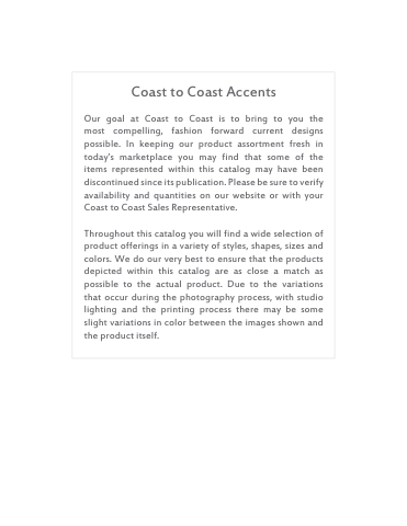 Our goal at Coast to Coast is to bring to you the most compelling, fashion forward current designs possible. In keeping our product assortment fresh in today’s marketplace you may find that some of the items represented within this catalog may have been discontinued since its publication. Please be sure to verify availability and quantities on our website or with your Coast to Coast Sales Representative.