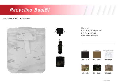 Recycling Bag(B) Size: (L)22 x (W)13 x (H)30 cm Material: NYLON 500D CORDURA NYLON WEBBING DURAFLEX BUCKLE BLACK COYOTE MULTICAM ALPINE RBL1BKN RBL1CON RBL1MAN MULTI TERRAIN DARKNESS AOR1 RBL1MTN RBL1DNN RBL1ARN Tactical Kit
