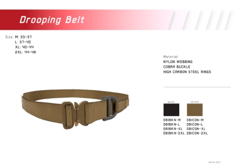 Drooping Belt Size: M: 33~37 L: 37~40 XL: 40~44 2XL: 44~48 Material: NYLON WEBBING COBRA BUCKLE HIGH CARBON STEEL RINGS BLACK COYOTE DB1BKN-M DB1CON-M DB1BKN-L DB1CON-L DB1BKN-XL DB1CON-XL DB1BKN-2XL DB1CON-2XL Battle Belt