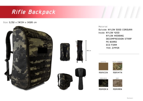 Rifle Backpack Size: (L)52 x (W)34 x (H)26 cm Material: Outside: NYLON 500D CORDURA Inside: NYLON 420D NYLON WEBBING DECOMPRESSION STRAP PE BOARD ECO FOAM YKK ZIPPER 106 cm COYOTE MULTI TERRAIN RBA1CON RBA1MTN DARKNESS AOR1 RBA1DKN RBA1ARN Backpack