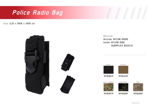 Police Radio Bag Size: (L)5 x (W)6 x (H)15 cm Material: Outside: NYLON 1000D Inside: NYLON 150D DURAFLEX BUCKLE BLACK COYOTE RPB1BKP RPB1COP MULTI TERRAIN DARKNESS AOR1 RPB1MTP RPB1DNP RPB1ARP Tactical Kit