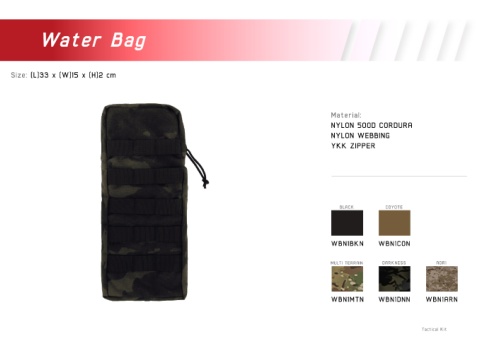 Water Bag Size: (L)33 x (W)15 x (H)2 cm Material: NYLON 500D CORDURA NYLON WEBBING YKK ZIPPER BLACK COYOTE WBN1BKN WBN1CON MULTI TERRAIN DARKNESS AOR1 WBN1MTN WBN1DNN WBN1ARN Tactical Kit