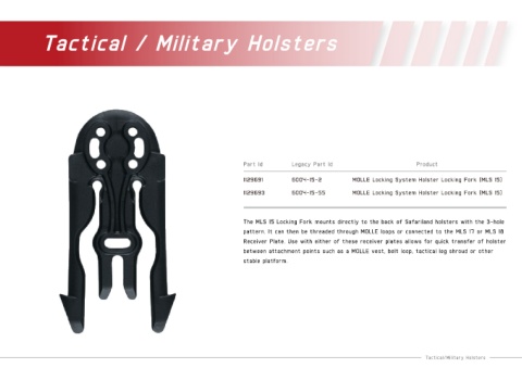 The MLS 15 Locking Fork mounts directly to the back of Safariland holsters with the 3-hole