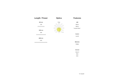 Length / Power Optics Features 994 mm Frost LED 250º 150º 150º 12W 3000 K 120º 120º 4000 K Tunable White * 90º 90º 50 1500 mm 100 60º 150 60º 200 18W 30º 30º cd/klm 0º Control On/Off 2000 mm 24W Materials PMMA General Class III IP40 IK04 *on request