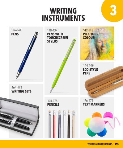WRITING 3 INSTRUMENTS 116-141 118-137 142-143 PENS PENS WITH PICK YOUR TOUCHSCREEN COLOUR STYLUS 144-149 ECO-STYLE PENS 164-173 WRITING SETS 174-175 176-178 PENCILS TEXT MARKERS 114 WRITING INSTRUMENTS 115