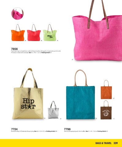 Nonwoven (80 gr/m 2 ) laminated shopping bag. Size 46 × 35,5 × 0,1 cm Packing details 200 Jute carry/shopping bag with short handles. Size 41 × 36 × 16,5 cm Packing details 50