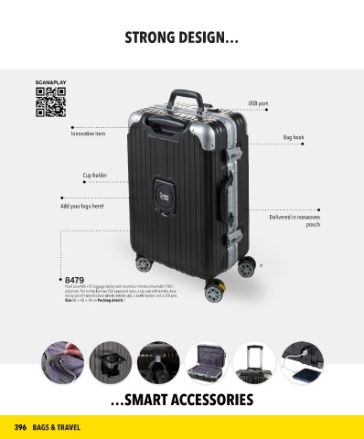 polyester. The trolley has two TSA-approved locks, a top and side handle, four 02