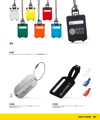 Aluminium luggage tag with a metal cord fastening. Size 8,5 × 3,8 × 0,2 cm Plastic luggage tag with adjustable strap. Label: 4 x 7 cm. Size 9 × 5,1 × 0,5 cm