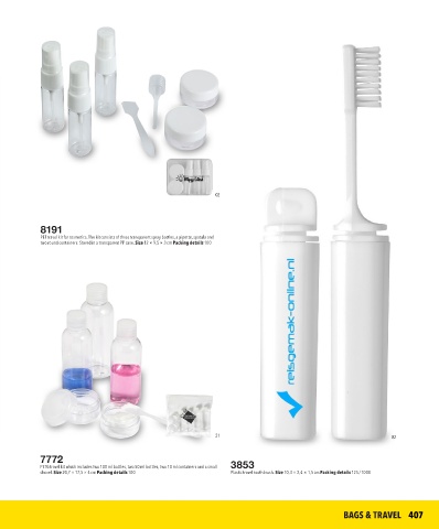 …EVEN ON VACATION PETG travel kit which includes two 100 ml bottles, two 50 ml bottles, two 10 ml containers and a small Plastic travel toothbrush. Size 10,3 × 2,4 × 1,5 cm Packing details 125 / 1000