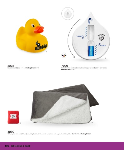PVC rubber duck. Size 7,5 × 9 × 8 cm Packing details 50 / 100 Plastic shower five minute sand timer with suction cap on the back. Size 9,9 × 12,7 × 3,7 cm