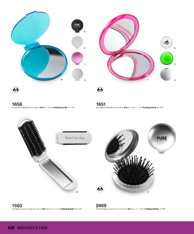 Foldable plastic hair brush with mirror. Size 10,8 × 4 × 2,7 cm Packing details 100 / 400 Plastic foldable pocket mirror and brush. Size 6,6 × 3 × 7,4 cm Packing details 72 / 288
