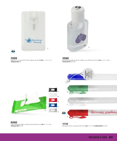 Hand spray in a transparent PET credit card shaped case (20 ml). Size 8,7 × 5,5 × 1,1 cm Hand cleansing gel with moisturizers and vitamin E in a PET container (15 ml). Size 3,2 × 6,3 × 1,8 cm
