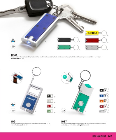 Plastic key holder with a push button LED light and a metal key ring. Batteries included. Colour 01, 06, and 32 are solid colours; colour 04, 05, and 08 are transparent colours. Size 6 × 2,4 × 0,6 cm