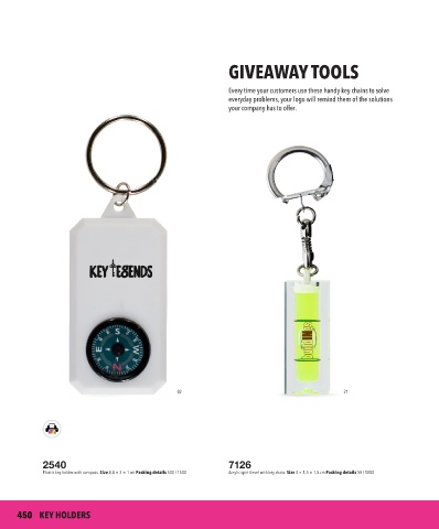 Plastic key holder with compass. Size 8,8 × 3 × 1 cm Packing details 500 / 1500 Acrylic spirit level with key chain. Size 4 × 1,5 × 1,5 cm Packing details 50 / 1000
