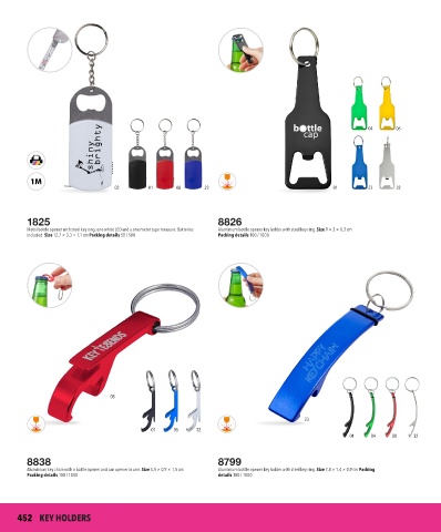 Aluminium key chain with a bottle opener and can opener in one. Size 5,5 × 0,9 × 1,5 cm Aluminium bottle opener key holder with steel key ring. Size 7,8 × 1,4 × 0,9 cm Packing