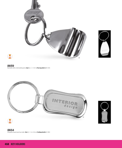 32 8659 Key holder with a metal bottle opener. Size 8,6 × 3 × 0,7 cm Packing details 50 / 300 08 01 23 32 01 23 32 8654 Elongated shaped metal key holder. Size 8,3 × 3,3 × 0,4 cm Packing details 50 / 300 458 KEY HOLDERS 459