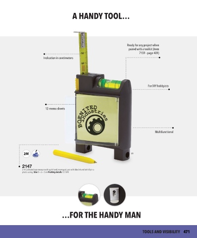 2 m Calibrated tape measure with spirit level, memo pad, pen with blue ink and belt clip in a