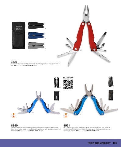 folded into the handles: screwdrivers (flat-head and Philips), file, saw, knife, nutcracker, can opener and screwdrivers (one flat-head and one Philips), a file, a bottle opener, a fish scraper, a nutcracker and a