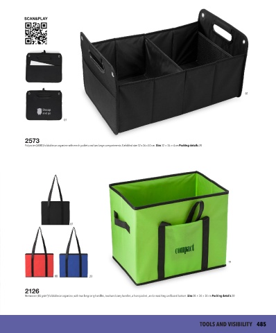 Nonwoven (80 gr/m 2 ) foldable car organizer, with two long carry handles, two hand carry handles, a front pocket , and a matching cardboard bottom. Size 28 × 34 × 24 cm Packing details 20