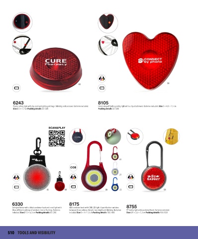Plastic safety light with clip and two lighting settings: blinking and constant. Batteries included. Heart-shaped flashing safety light with a clip attachment. Batteries included. Size 5 × 4,8 × 1,1 cm