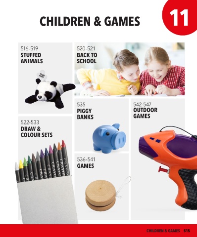 CHILDREN & GAMES 11 516-519 520-521 STUFFED BACK TO ANIMALS SCHOOL 535 542-547 PIGGY OUTDOOR BANKS GAMES 522-533 DRAW & COLOUR SETS 536-541 GAMES 514 CHILDREN & GAMES 515