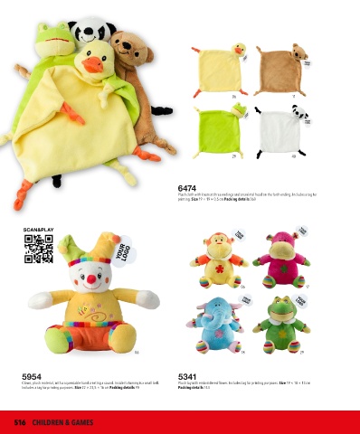 Clown, plush material, with a squeezable hand creating a sound. Inside its tummy is a small bell. Plush toy with embroidered flower. Includes tag for printing purposes. Size 19 × 18 × 13 cm