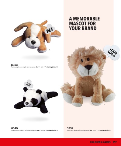 Plush toy panda. Includes a tag for printing purposes. Size Ø 13,5 × 17 cm Packing details 120 Soft toy lion. Includes tag for printing purposes. Size 12 × 12 × 9 cm Packing details 312