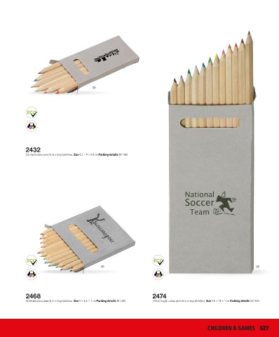 12 Small colour pencils in a recyclable box. Size 9 × 8,6 × 1 cm Packing details 20 / 400 12 Full length colour pencils in a recyclable box. Size 9,5 × 18 × 1 cm Packing details 24 / 240