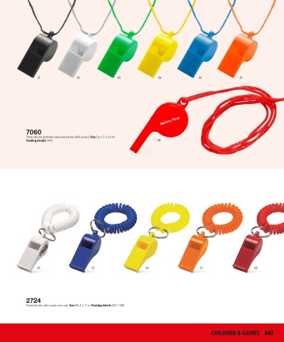 Plastic whistle with a spiral wrist cord. Size Ø 5,5 × 11 cm Packing details 250 / 1000