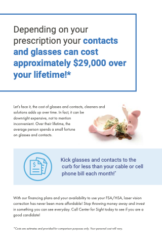 With our financing plans and your availability to use your FSA/HSA, laser vision correction has never been more affordable! Stop throwing money away and invest in something you can see everyday. Call Center for Sight today to see if you are a good candidate!