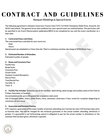 The following agreement is between Governors Towne Club (“GTC”) of 4545 Champions Walk Drive, Acworth, GA 30101 and (client). The general terms and conditions for your special event are outlined below. The particulars will be specified in our Event Memorandum (addendum/BEO) to be completed by you and the event coordinator at a later date.