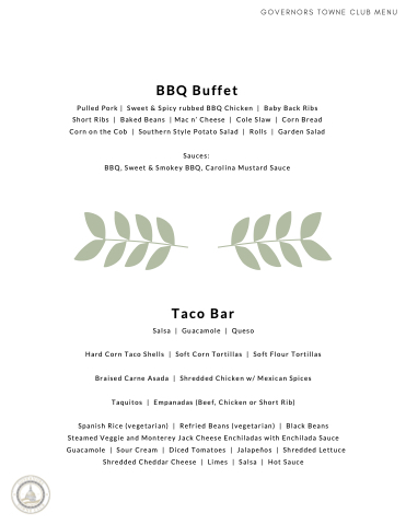 Pulled Pork | Sweet & Spicy rubbed BBQ Chicken | Baby Back Ribs Short Ribs | Baked Beans | Mac n’ Cheese | Cole Slaw | Corn Bread Corn on the Cob | Southern Style Potato Salad | Rolls | Garden Salad
