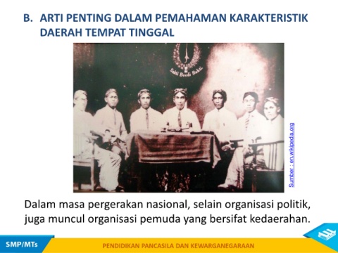 B. ARTI PENTING DALAM PEMAHAMAN KARAKTERISTIK DAERAH TEMPAT TINGGAL : en.wikipedia.org Sumber Dalam masa pergerakan nasional, selain organisasi politik, juga muncul organisasi pemuda yang bersifat kedaerahan. PENDIDIKAN PANCASILA DAN KEWARGANEGARAAN