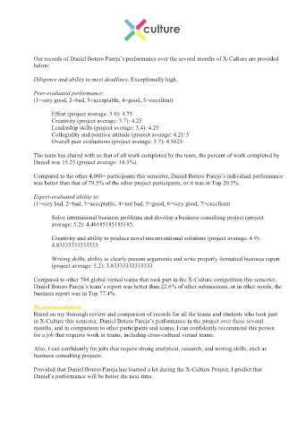 in X-Culture this semester, Daniel Botero Pareja’s performance in the project over these several
