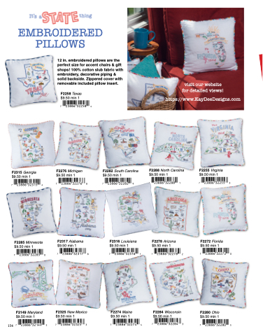 12 in. embroidered pillows are the perfect size for accent chairs & gift shops! 100% cotton slub fabric with embroidery, decorative piping & solid backside. Zippered cover with removable included pillow insert.
