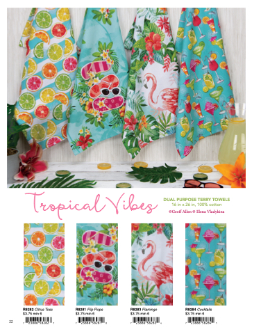 Tropical Vibes R8282 Citrus Toss R8281 Flip Flops R8283 Flamingo $3.75 min 6 $3.75 min 6 $3.75 min 6 DUAL PURPOSE TERRY TOWELS 16 in x 26 in, 100% cotton ©Geoff Allen © Elena Vladykina R8284 Cocktails $3.75 min 6 22