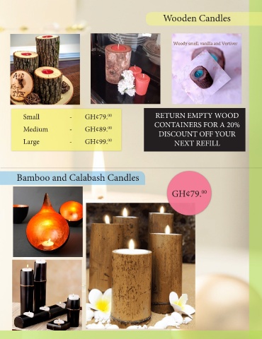 Wooden Candles Small - GH¢79. 00 RETURN EMPTY WOOD CONTAINERS FOR A 20% Medium - GH¢89. 00 DISCOUNT OFF YOUR Large - GH¢99. 00 NEXT REFILL Bamboo and Calabash Candles GH¢79. 00