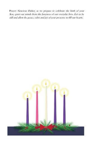 Prayer: Gracious Father, as we prepare to celebrate the birth of your Son, quiet our minds from the busyness of our everyday lives. Let us be still and allow the peace, calm and joy of your presence to fill our hearts. Friday, December 21