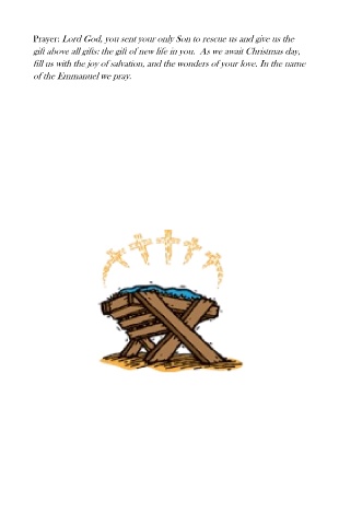 Prayer: Lord God, you sent your only Son to rescue us and give us the gift above all gifts: the gift of new life in you. As we await Christmas day, fill us with the joy of salvation, and the wonders of your love. In the name of the Emmanuel we pray.