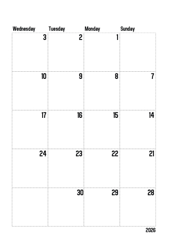 Wednesday Tuesday Monday 321 10 9 8 17 16 15 24 23 22 30 29 Sunday 7 14 21 28 2026