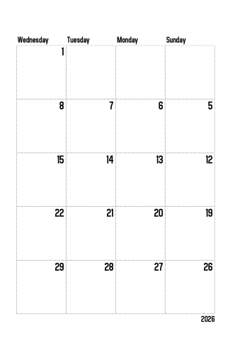 Wednesday Tuesday Monday Sunday 1 8765 15 14 13 12 22 21 20 19 29 28 27 26 2026