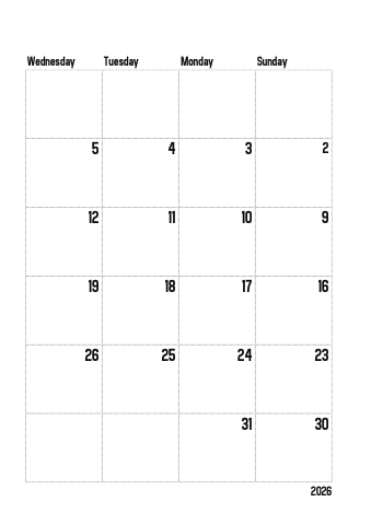 Wednesday Tuesday Monday Sunday 5432 12 11 10 9 19 18 17 16 26 25 24 23 31 30 2026